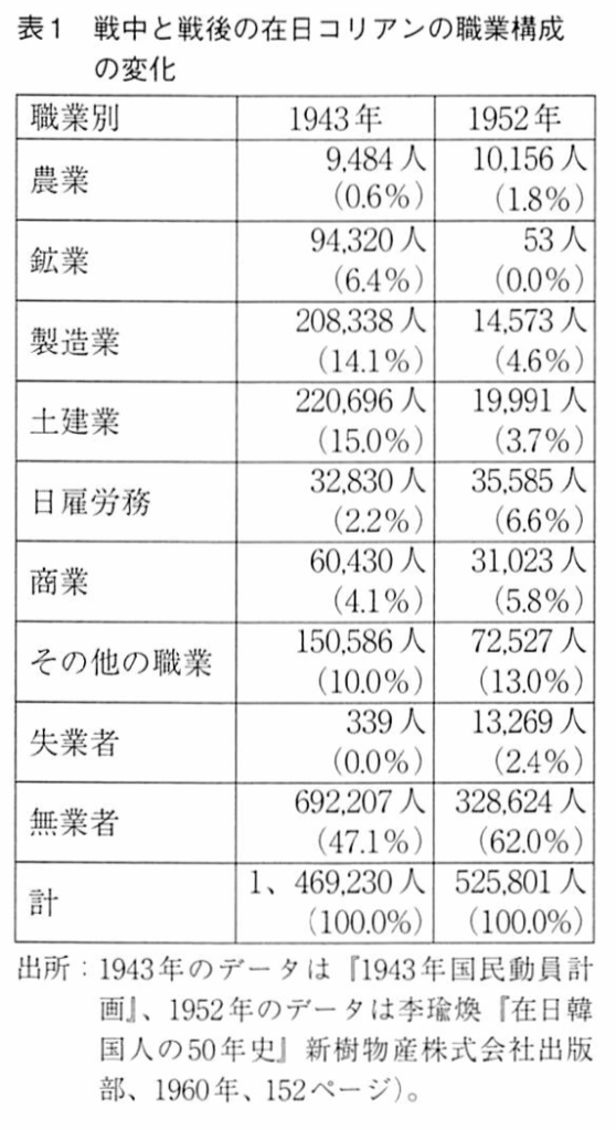1945年の祖国の解放を機に在日コリアンの多くは朝鮮半島に戻ったが、さまざまな事情で日本にとどまることを余儀なくされた者たちもいた。だが、彼らの職探しは戦時中以上に厳しいものになった。戦争特需が終わったことで、日本の製造業が不況になるとともに、戦争に駆り出されていた日本人労働者が復員したことで、在日コリアンの労働者が労働市場からはじき出されてしまったからである。戦中の1943年と解放直後の1952年の在日コリアンの職業構成の変化を示した〈表1〉を見ると、戦後は製造業従事者と土建業従事者が大きく減る一方、日雇い労働者が増加し、失業者が急増していることが判る。