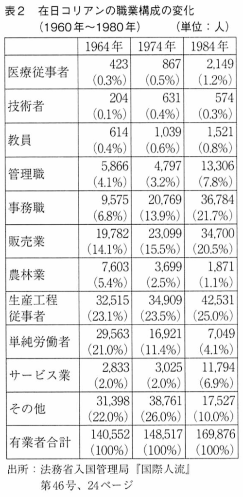 だが1980年代になると、在日コリアンの自営業者や中小企業主の中から、日本経済の安定成長の波に乗り、中小企業の経営者として成功を収める旧中産層や、大学を出て日本の企業に採用される新中産層が膨らみを見せ始めることになった。こうした傾向は、表2に示した1960年代から1980年代にかけての在日コリアンの職業構成の変化からも読み取ることができる。同表を見ると、1960年代〜1980年代にかけて、在日コリアンの職業構成のうち単純労働者や農林業などブルーカラーの比重が大きく低下し、その一方で管理職、事務職、販売業、サービス業などのホワイトカラーの比重が増加していることが判る。また医療従事者や教員などの専門職も確実に就業者比率を増加させている。