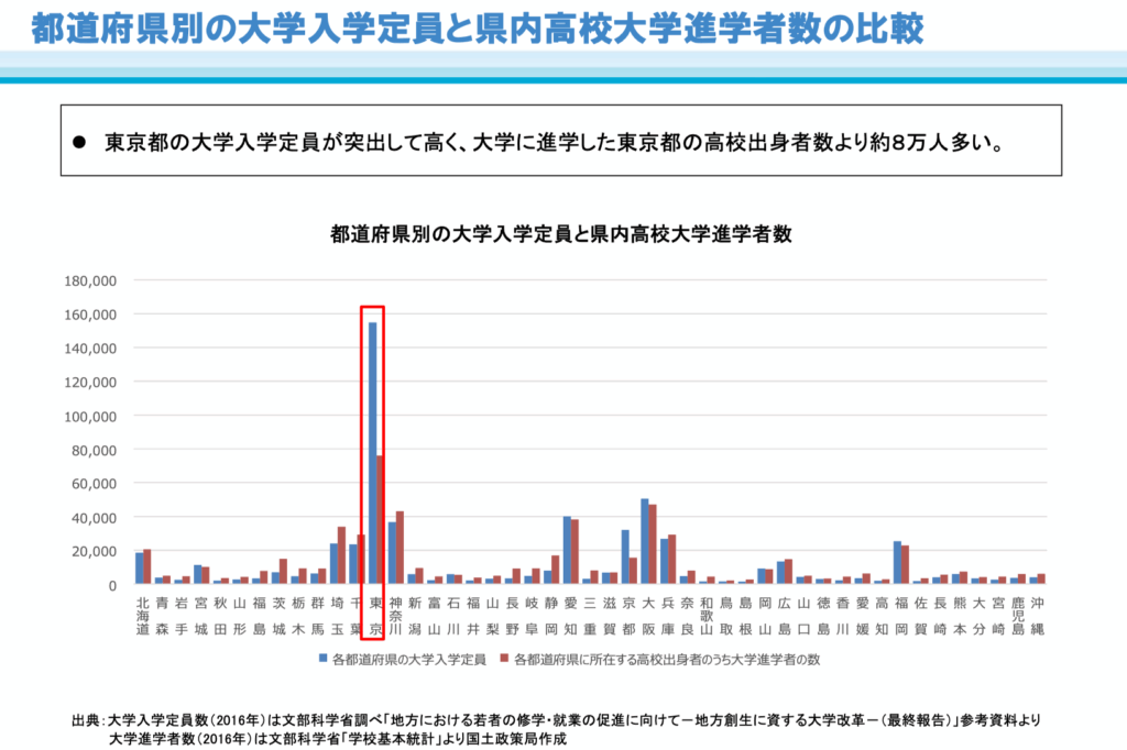 都道府県別の大学入学定員と県内高校大学進学者数の比較(2016年)