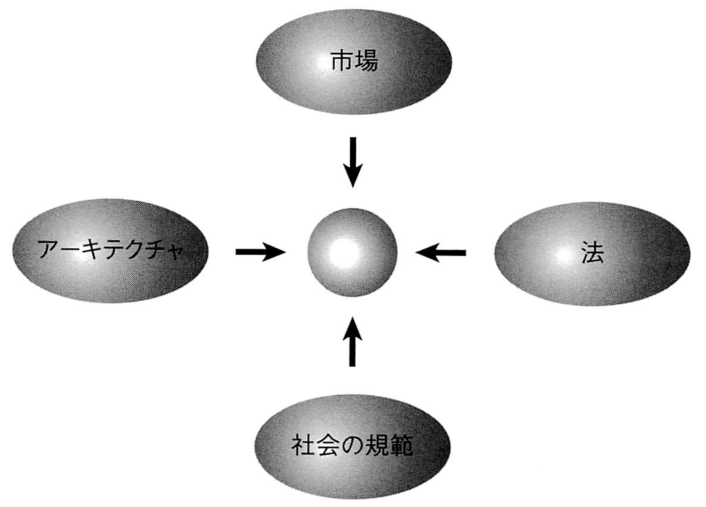 実空間での場合と同じように、これらの四つのモードがサイバー空間を規制する。同じバランスが存在する。ウイリアム、ミッチェルが述べているとおりだ(ただしかれは市場の制約を見落としているけれど)。