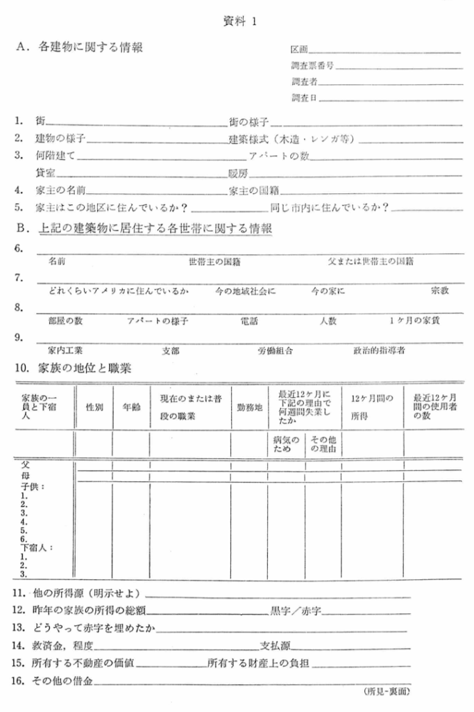 また、インタビューによるデータとしては、この地域をよく知っている古くからの住人や有力者とのインフォーマル・インタビューによるものだけでなく、資料1で見られるような調査票を用いたフォーマル・インタビューも行なわれている。この調査は、簡易宿泊所(rooming house)に住む人達の家賃、収入、家族構成を調べるために行なわれたものであり、それは戸別訪問調査(house, o’house survey)によってデータが収集された。このようにして収集されたドキュメントは、1から73までの数字がふられて引用されている。だが、それらの出所が明示されていないので、データとしての信憑性がいまひとつ定かでない、という問題がある。とはいえ、こうしてみて明らかなように、ゾーボーの調査は、そこで関係のあるデータはすべて収集し、利用しようとする姿勢がよく表われている。この点で、『ゴールドコーストとスラム』は、まさに広範なデータを多角的方法によって収集しようとする初期シカゴ社会学のモノグラフの典型例だということがよくわかる。