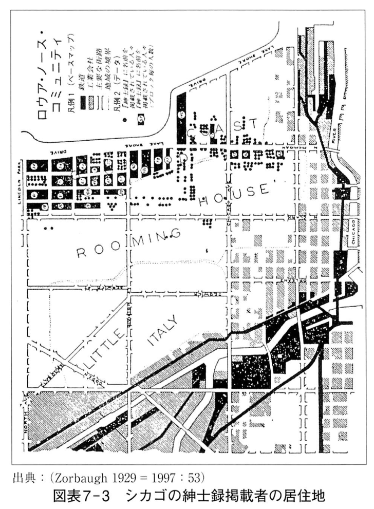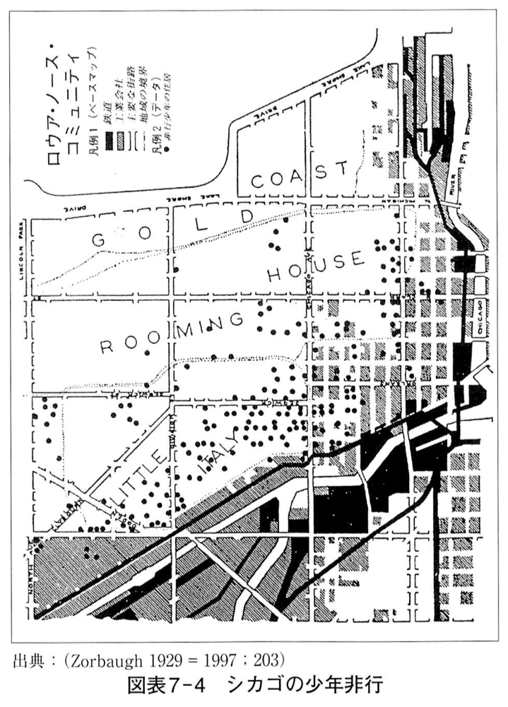 シカゴ大学の大学院生として都市研究を行っていたゾーボーは,ミシガン湖の湖岸に広がるシカゴの高級住宅街である『ゴールドコースト』とこれに隣接するスラム街であるニア・ノース・サイド地区を数多くの社会地図を用いて分析した。ここでゾーボーは,隣接する2つの地区の社会的世界の違いを明確に示すとともに,スラム街に少年非行などの社会問題が集積していることを明らかにしている。たとえば図表7-3では『紳士録』に掲載された人の居住地が点で示されているが,地図の上部(ゴールドコースト)に掲載者を示す点が集まり,さらには多数の掲載者がいることから塗りつぶされていることがわかる。これに対して非行少年達の居住地(図表7-4)は,図表7-3とは対照的に湖岸から離れた地域(地図中央部から下。リトルイタリーを中心としたニア・ノース・サイド地区)に広がっており,『紳士録』掲載者の居住地とは一致しないことが見て取れる。この2枚の地図を重ね合わせて考えることで,少年非行が階層的に低い人びとが集住する地域で発生していることがわかる。こうした複数の地図を同時に検討することで社会-空間構造の理解を深めることができるのである